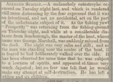 Hannah born 1798 and baptised Lockton and died in 1874 at Scarborough. She married George Marshall in 1826 at Scarborough. George was a Merchant Seaman fisherman who died at sea 1861, possible suicide. See newspaper clipping.